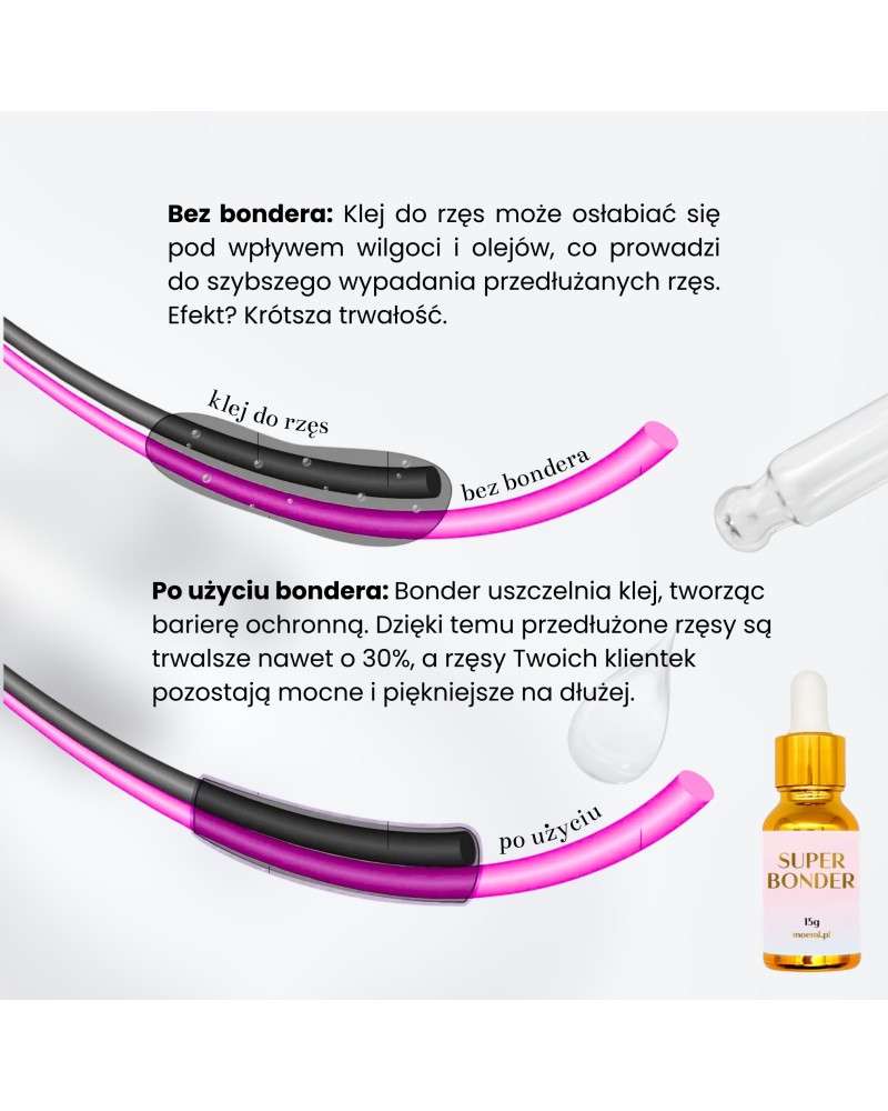 Krótsza trwałość aplikacji: Dzięki zastosowaniu Super Bondera, rzęsy utrzymują się dłużej. Produkt zwiększa odporność na czynniki zewnętrzne, co pozwala klientkom cieszyć się pięknymi rzęsami przez dłuższy czas.
