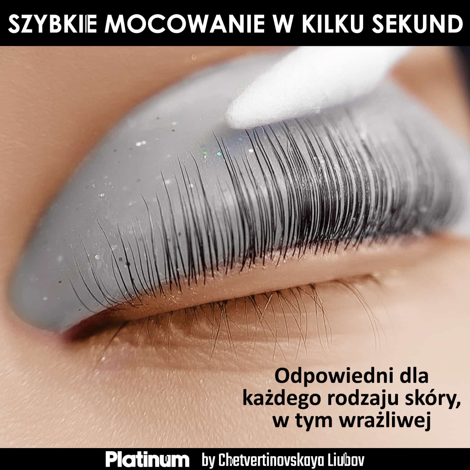 - Oczyść powieki i rzęsy osobno pianką do demakijażu PLATINUM firmy Chetvertinovskaya Liubov i aplikatorem. Następnie delikatnie przetrzyj skórę wacikiem zwilżonym wodą